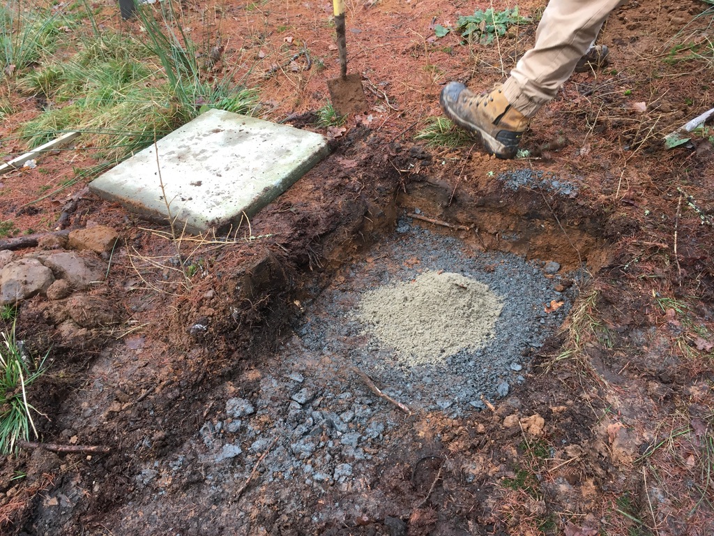 This hut stands on nine, two-inch-thick, concrete paving slabs. Each slab is 2ft square (600mm x 600mm). The kind of slab you can find in any builder's merchant or garden centre. Dig down until you hit solid sub-soil, add some 'type one' (crushed rock) and use sand to bed the slab and get it level.